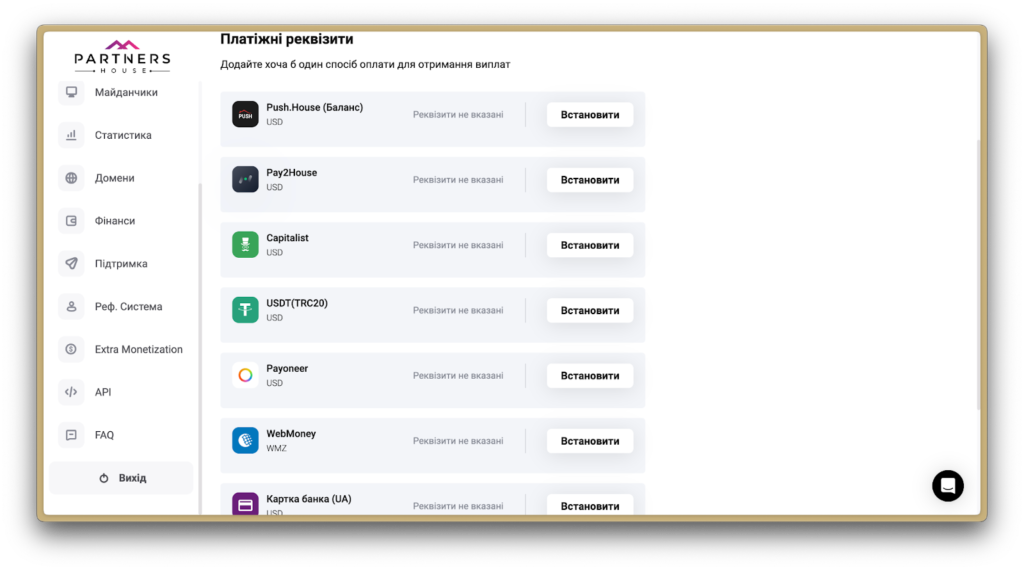 І якщо у випадку заливу з того ж Push.House на офери в CPA.House, що входять в House Holding, ви заробляєте, монетизуючи свій трафік через різні рекламні формати, то у випадку з Partners.House – це інструмент для вебмайстрів, що мають власні вебсайти та хочуть монетизувати трафік з них, шляхом розміщення рекламних оголошень.