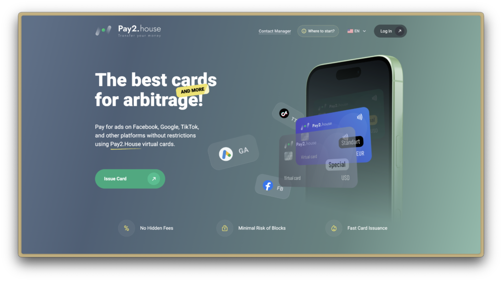 Платіжка підходить для медіабаїнгу і в’яжеться до Facebook, Google, TikTok, Snapchat та інших. Також за допомогою цих віртуалок можна поповнювати баланс рекламних кабінетів в рекламних мережах, а на баланс сітки Push.House (ред. входить в холдинг House Holding) – гроші можна вивести напряму за кілька хвилин.