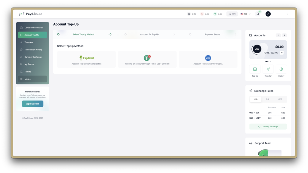 Pay2.House – платіжний сервіс, що дозволяє випускати безлімітну кількість віртуальних карток, робити масові платежі, обмінювати валюту та отримувати гроші без відкриття рахунків в пару кліків.