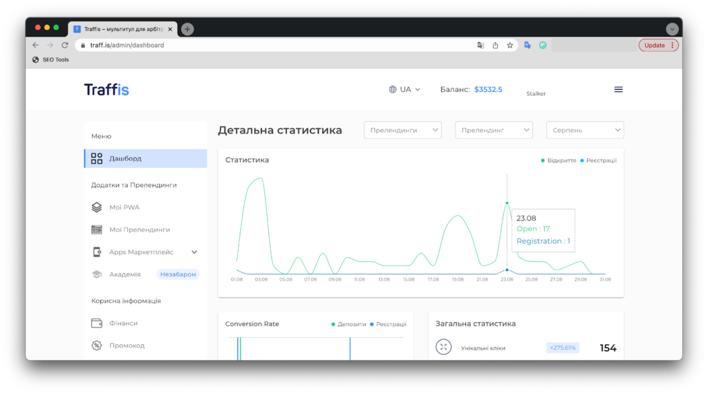 - Дашборд – статистика по залитому трафіку в real-time, як загальна, так і по кожному окремому прелендингу, PWA або потоку. Загалом, все інтуїтивно зрозуміло і не викликає питань;