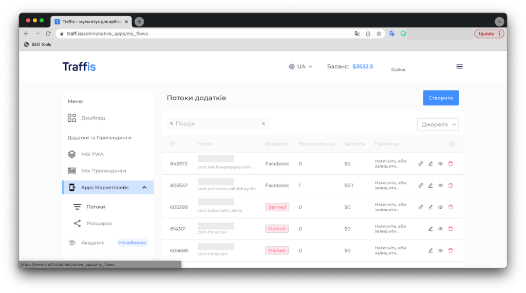 - Apps Marketplace – розділ містить маркетплейс webview-застосунків, які можна в пару кліків розшарити через розділ “Розшарка” та контролювати їх статус: Marked (помічені FB), Banned (забанені в FB) або просто Facebook (якщо застосунок активний);