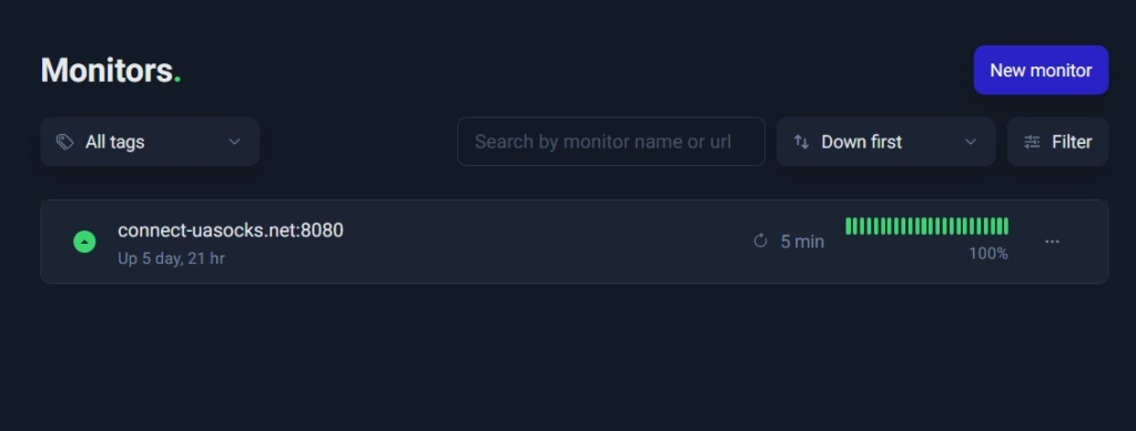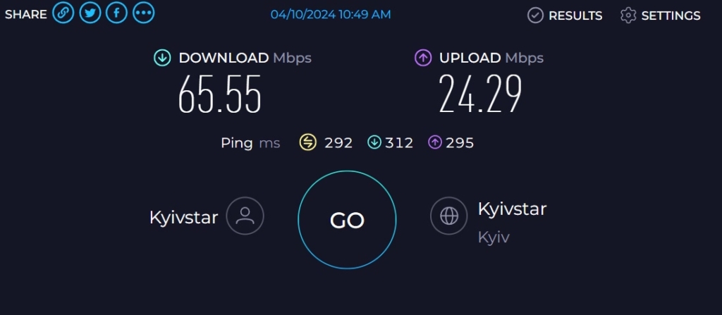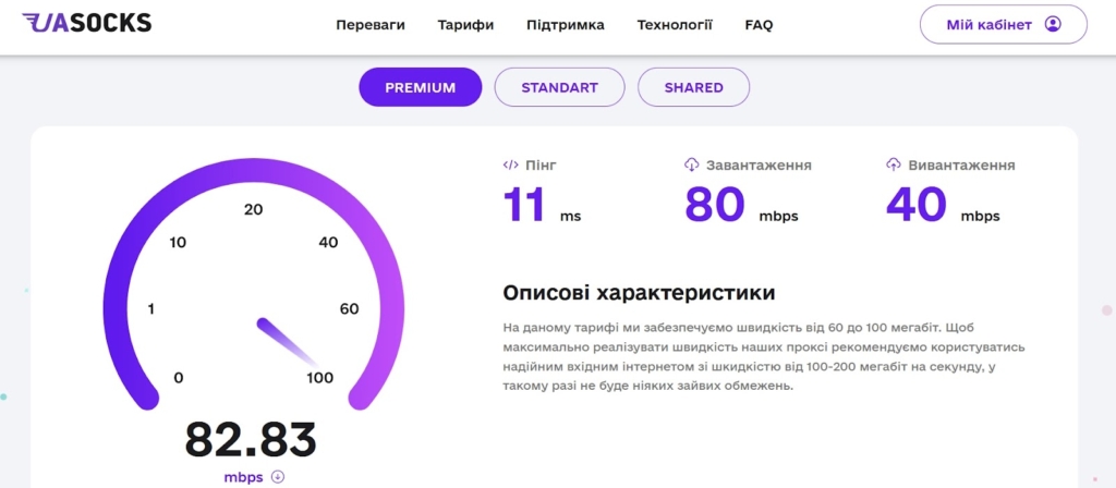 На головній сторінці UASOCKS є віджет з тестами швидкості завантаження та вивантаження файлів для кожного тарифу.
